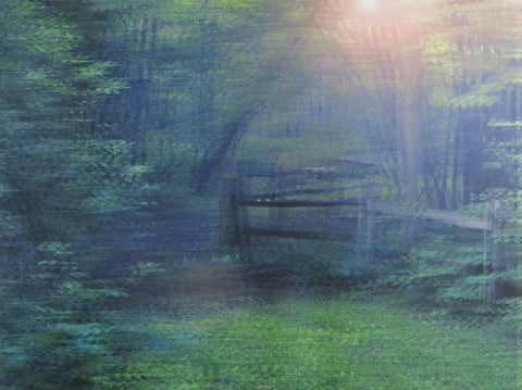 Jacob Lunderby, Set/Setting: Pathway Through Woods, inkjet ink, digital ground and varnish on archival polyester film mounted to panel, 16” x 21.5”
