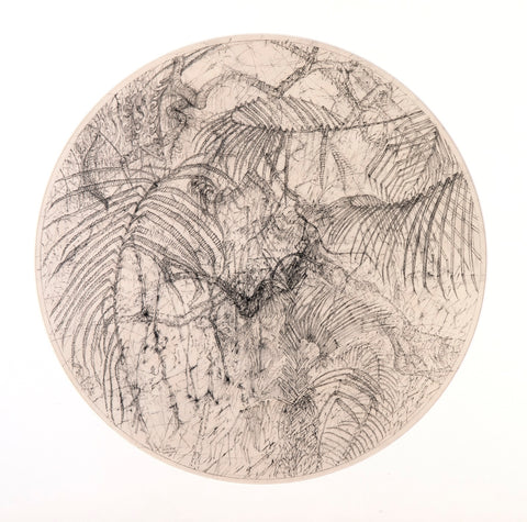 Ten Thousand Storms, #56, At Parnells Knob, graphite and metal point on paper, 12" diameter