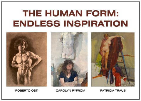 Cerulean Arts is pleased to present The Human Form: Endless Inspiration featuring drawings and paintings by Robert Osti, Carolyn Pyfrom and Patricia Traub. Study, observation and interpretation of the human figure is the center of each artist’s creative endeavors. Roberto Osti’s sensitively rendered charcoal and chalk drawings on toned paper are precisely accurate but breathe with life. The rigorous anatomical study of the human figure is not a restriction for Osti, but an aid to creative freedom. For Carolyn Pyfrom, every act of painting provides an opportunity to test what one notices, pays attention to, and cares about. She aims to create a convincing sense of light and atmosphere, working with a muted, carefully controlled palette that accentuates the textural quality of her figure paintings. Patricia Traub’s virtuoso oil studies display her complete knowledge of the human form translated into paint. She works from observation to create arresting works of humans and animals, the context of which is about our responsibility to all living things and the environment in which we live.
