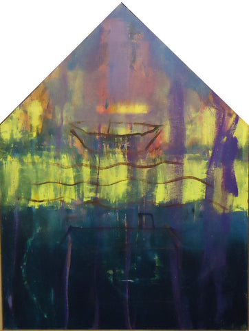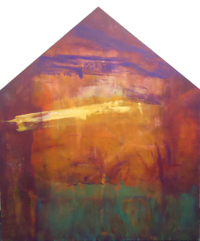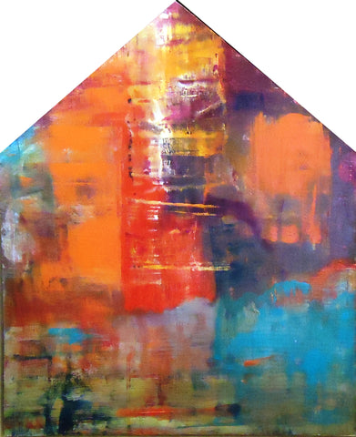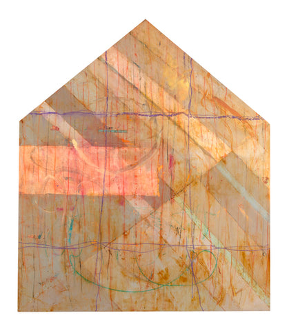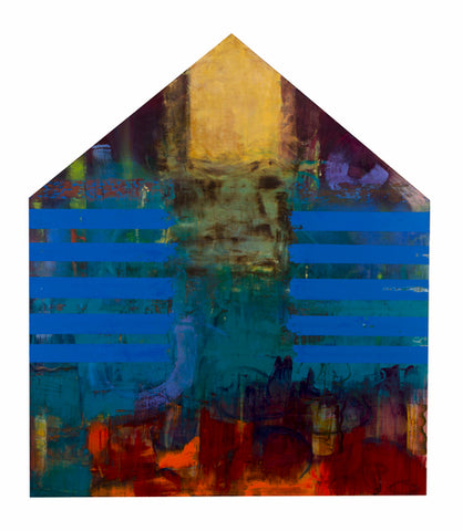 I began this series with an investigation into the geometry of the house shape. With its implicit arrow and upward point, what compositional demands did this shape make of me? Were divisions, diagonals, and architectural references required? When did a rectangle read as a door, or a stripe connote a steel beam - that is, when did colors and forms become descriptive, rather than evocative? In addition to architecture, I looked to Cave Art (the original house paintings) and medieval church art, for clues to working with this shape. Throughout, no matter where I painted on the panel, I was aware of the apex. It exerted control over where I placed my every stroke. It seemed that I was always painting to the point, regardless of where I was.