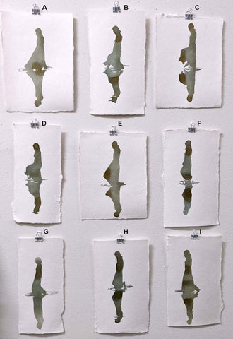 Stockton Moore, Reflection Movement Studies (9 works), artist-made blueberry ink on paper, 8" x 4-6"