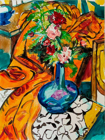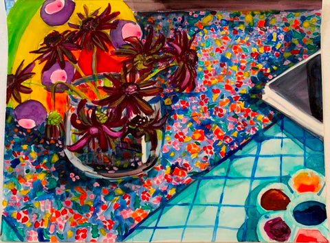 Whearty, Still Life with Zinnias, watercolor on Yupo, 9" x 12"