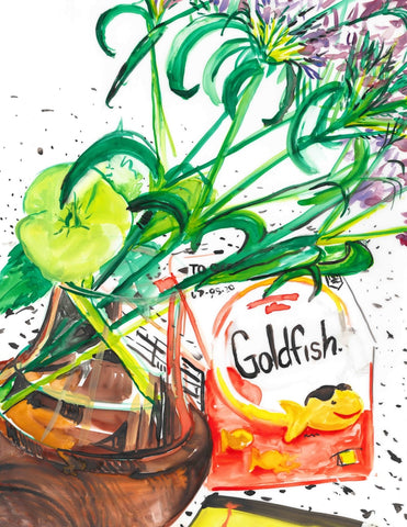 Whearty, Goldfish and Flowers, watercolor on Yupo, 14" x 11"