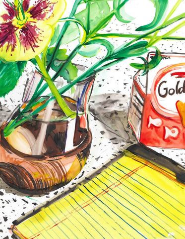 Whearty, Hellebore, Goldfish & Notepad, watercolor on Yupo, 11" x 14"