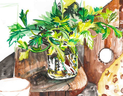 Whearty, Parsley on Cutting Board, watercolor on Yupo, 14" x 11"