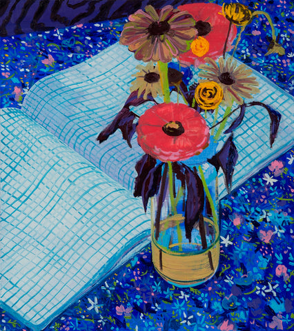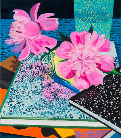 Whearty, Still Life with Zinnias & Composition Book, oil on canvas, 24" x 21"