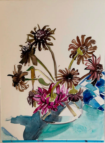 Whearty, Still Life with Zinnias, watercolor on Yupo, 12" x 9"