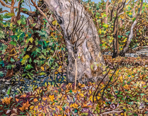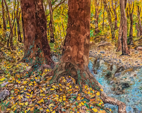Gary Grissom, Creek, Trees, Leaves, Morris Park, oil on panel, 11" x 14"